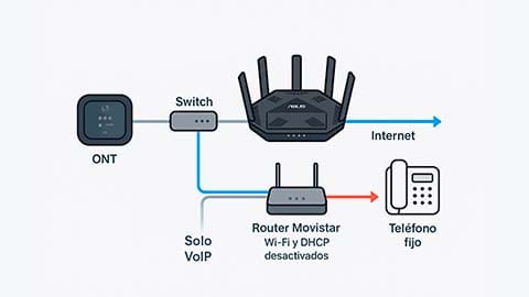 Solo necesitas tu ONT, tu router ASUS (o el que uses) y un terminal IP compatible. Personalmente, es la opción que más me gusta porque me permite mantener la red limpia, sin dependencias ni routers heredados.