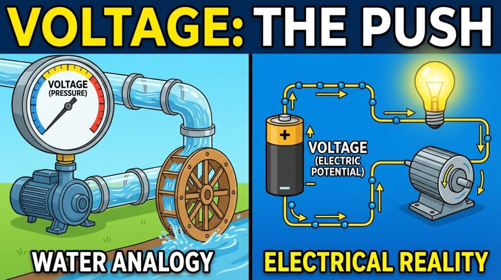 Imagine electricity is like water flowing through a pipe. In this analogy, voltage is the pressure pushing that water. Technically, it’s the electric potential difference or the “push” a power source exerts on electrons (the electric current) to make them move through a circuit and do useful work, like lighting a bulb or running a motor.